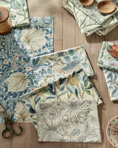 Ein Stück britischer Designgeschichte für Ihr Zuhause: Melsetter Tree zeigt ein kunstvolles Motiv aus Vögeln, Blüten und einem zentralen Fruchtbaum – inspiriert von den berühmten Bettvorhängen aus Kelmscott Manor, die einst für Melsetter House in Schottland gefertigt wurden.